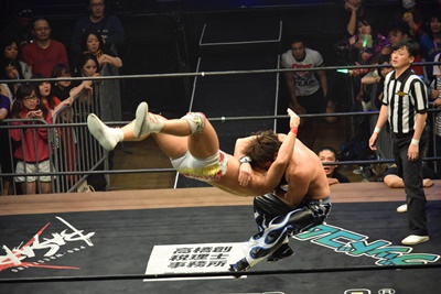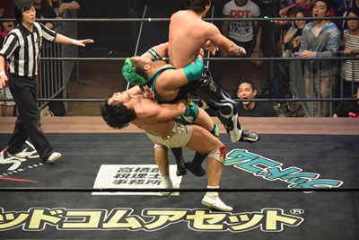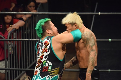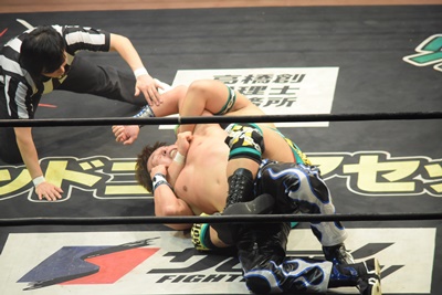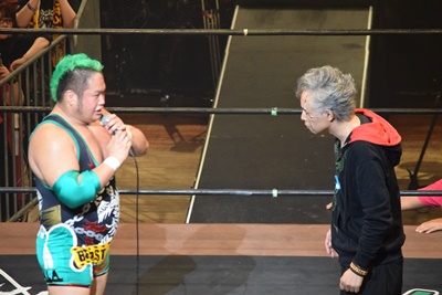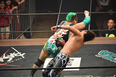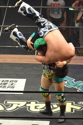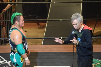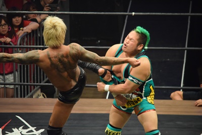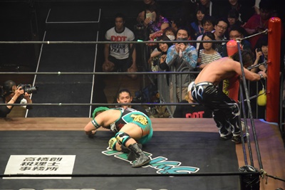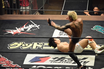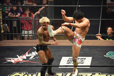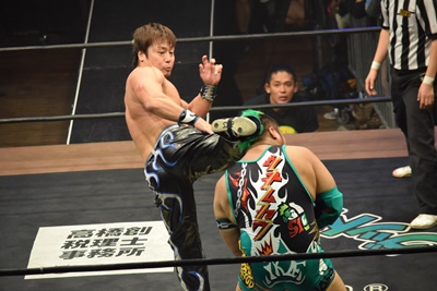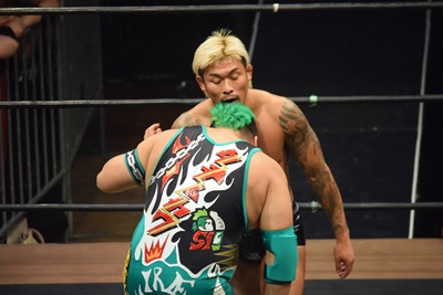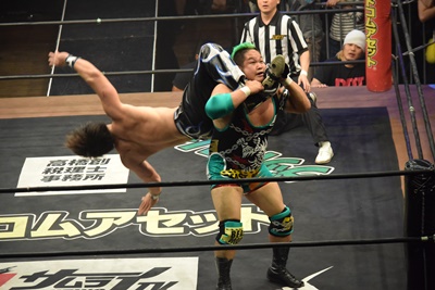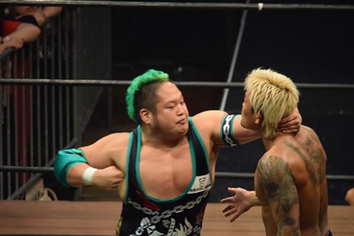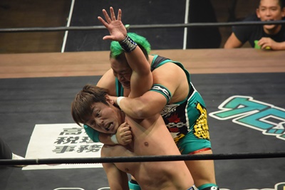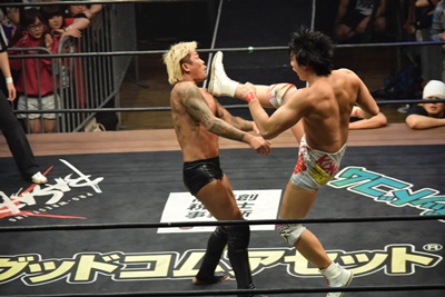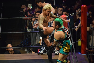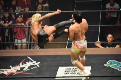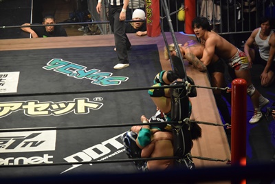 坂口ドロップキック(左写真)、HARASHIMAにタッチ。