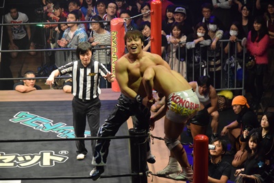 入江バックフリップ狙ってHARASHIMAを肩に担ぐ、坂口がそこに神の右ヒザ(右写真)。