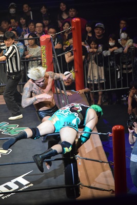 入江HARASHIMAをコーナーに振ってラリアット、コーナーに上る、HARASHIMA下からキック、坂口が入って下からヒザ蹴り(左写真)。