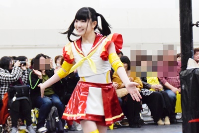 コスチュームに合わせた赤、黄、白の紙テープが飛ぶ(左写真)。