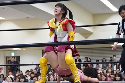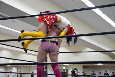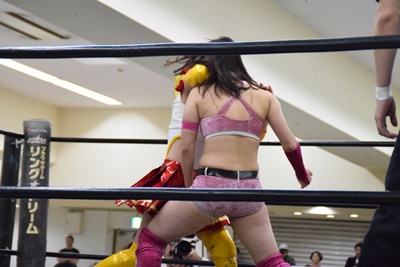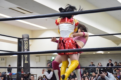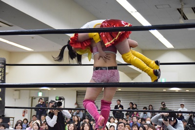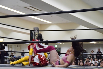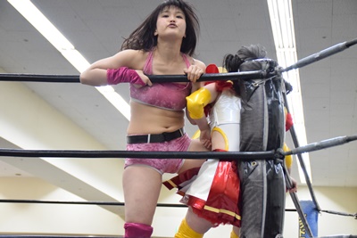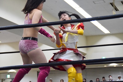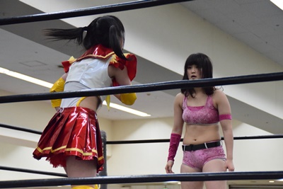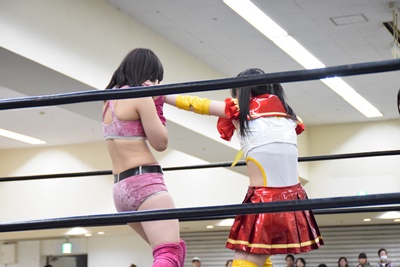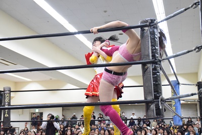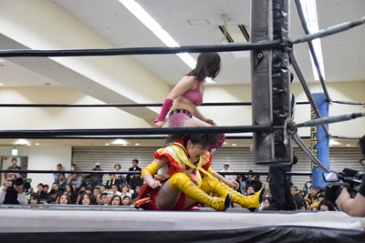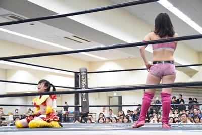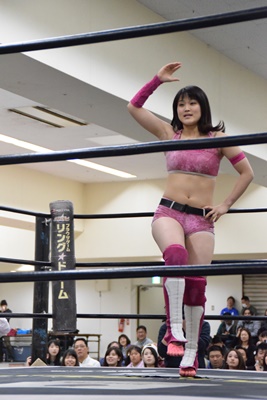 デビュー戦の相手はこちらも福岡出身、東京女子プロレスのエース・山下実優。「ジンギスカン」で踊りながら入場(右写真)。