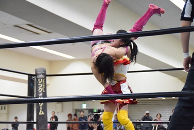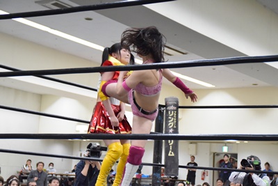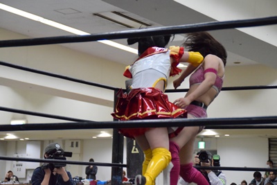 山下腕取ってホイップ、ロープに飛んで背中にスライディングキック(左写真)、カウント2。
