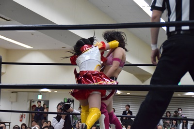 山下がリングを降りると伊藤マイクを持ち(左写真)、「もう伊藤が福岡もプロレスもアイドルもぜーんぶ盛り上げるから!みんな、ついてきてくださーい!あと、山下実優には実力で負けたけど、伊藤の方が顔はかわいいもん!ありがとうございました!」