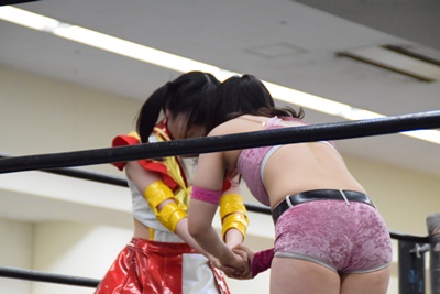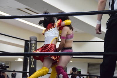 ロックアップから山下ヘッドロック(右写真)、伊藤ロープに振ってエルボー、カバー、カウント2。