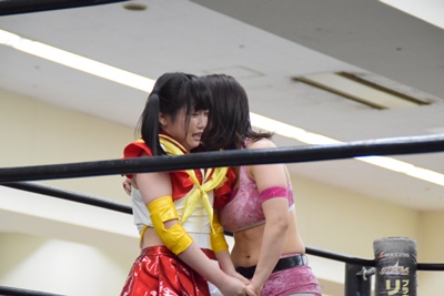 山下「でも、今日から同郷として私は伊藤麻希をライバルとして、見ます。もちろん負ける気もないし、また当たった時は、またぶっ倒しに行きます。でも、プロレスを、福岡を盛り上げたいという気持ちは私も、伊藤ちゃんも一緒だと思うので、これからは選手として、お互いに強くなって頑張っていきましょう。今日は本当にありがとうございました。」(左写真)
