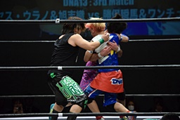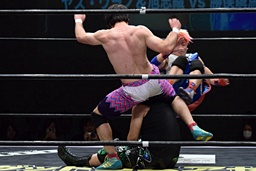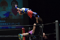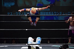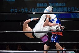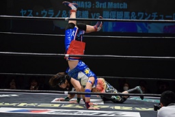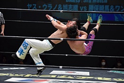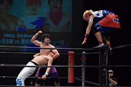 ワンチューロヘッドロックからフライングメイヤー、旭ヘッドシザーズ(右写真)。両軍タッチ。