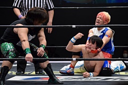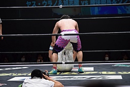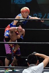 勝俣のダイビングフットスタンプとワンチューロのファイナルカットの合体技(右写真)、カバーはウラノがカット。勝俣ウラノを場外に出す。