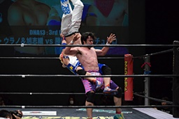 ワンチューロがクロスボディ、勝俣ワンチューロを踏み台にサマーソルトキック(左写真)。