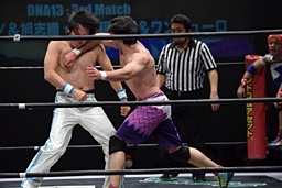 ワンチューロのキックと勝俣のドロップキックでサンドイッチ(右写真)。