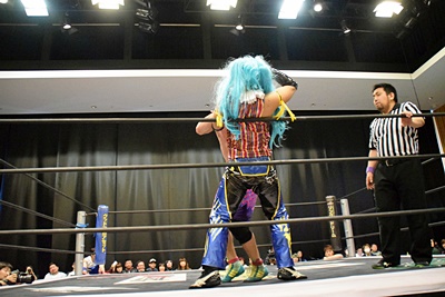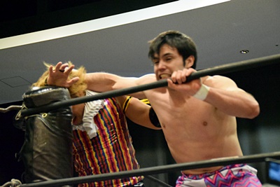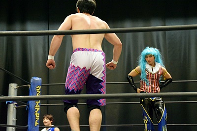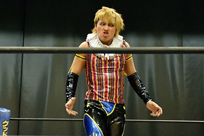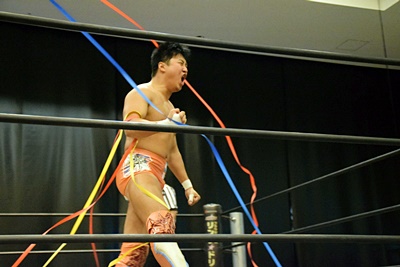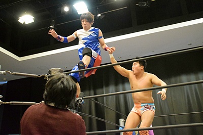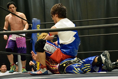 勝俣ドロップキック(右写真)、フットスタンプ、カウント2。ワンチューロにタッチ。