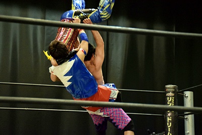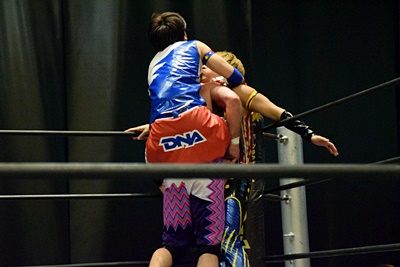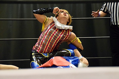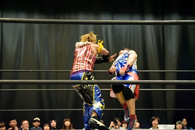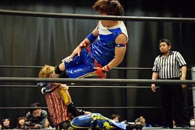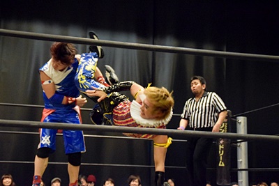 ワンチューロはボディスラムで投げて顔面にドロップキック(右写真)。