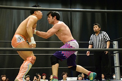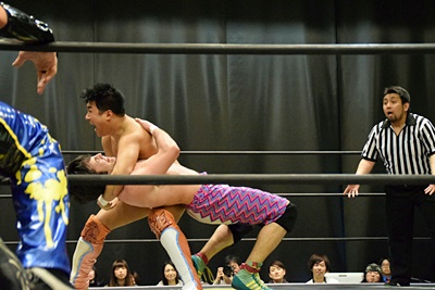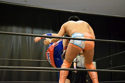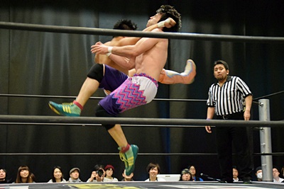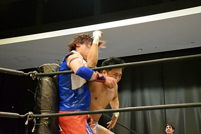 風戸ブロックしてロープに飛ぶとアックスボンバー(左写真)、カウント2。