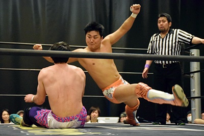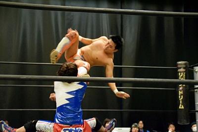 ワンチューロが入って風戸をホールド、勝俣がジャンプして背中にフットスタンプ(右写真)。