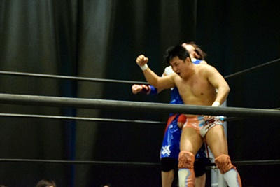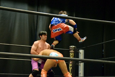 コーナーに上ってミサイルキック、勝俣かわし(左写真)、ワンチューロにタッチ。