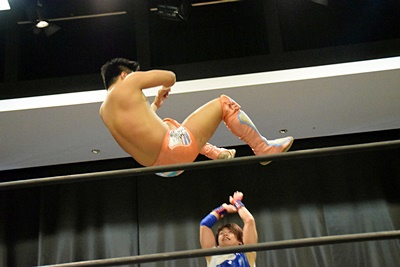 勝俣ロープに飛ぶ、風戸ソバット(左写真)、