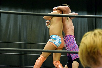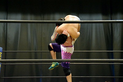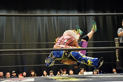 勝俣コーナーに上る、ワンチューロがリバースDDTの体勢、勝俣がダイビングフットスタンプを合わせる(左写真)、レインボーがカット。