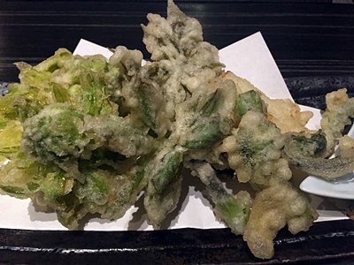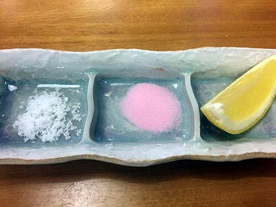 「おまかせ天へぎ」注文。まず出てきたのは塩2種とレモン。レモン汁を塩にかけて溶かして天ぷら食べるのだそうだ。初めて知った!