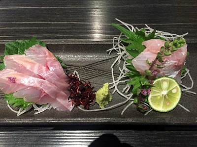終了後は長岡駅ビルの「あさひ山」に。まずは刺身。平目と鯛。