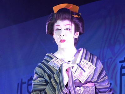 煌座の座長・煌京一郎。噂に聞いてた大衆演劇の世界が。「万札レイ」ではなく、レイは一本1000円払って購入、掛けてあげるスタイル、それとは別にお札をピンで留める人もいるという形。今日の前半のお芝居は柳沼さんに言わすと「今月で最低」。面白かったけどね、初見には。