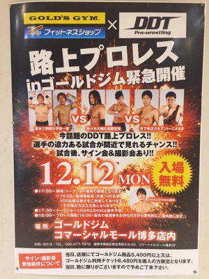 18時からゴールドジムで路上プロレス。オフリミットなし、土足で移動OKはありがたかった。試合は18時45分、竹下がウェイトプレートへの垂直落下式ブレーンバスターで平田から3カウント。無茶するなあ。