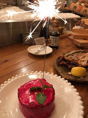 ケーキみたいに見えるが肉じゃが。赤いのはビーツのソース。花火はしゃれ。