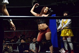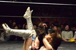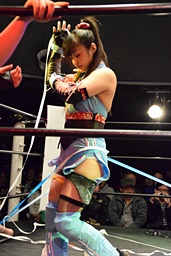 ロックアップ、のどねえ小橋の腕をひねり(右写真)KANNAにタッチ。小橋もMIZUHOにタッチ。