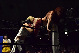 清水ボディスラム狙う、KANNA背後に着地してバックドロップ(右写真)、あずさにタッチ。