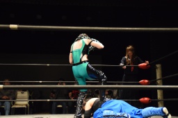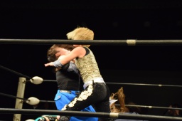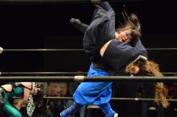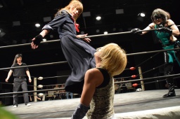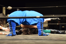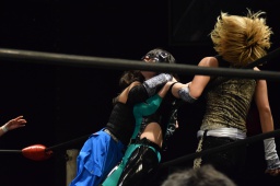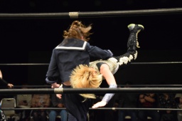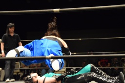 ハイパミKANNAをコーナーに振る、KANNA切り返してハイパミに串刺しエルボー、ミウラにタッチ。ミウラがボディスラムからキャトルミューティレーション(左写真)、赤宮がカット。