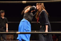 ロープワーク、赤宮がドロップダウンするとKANNAはキック(左写真)。