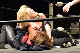 KANNAクローズライン、ミウラ入ってエルボー、KANNAキャメルクラッチ(右写真)。