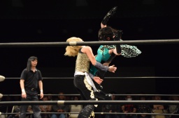 ハイパミコーナーに上ってアイアムアヒーロー(左写真)、カウント2。