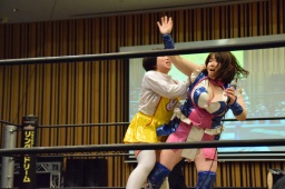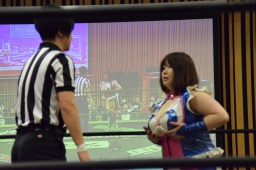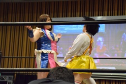 のの子はダンス対決を提案、おねえさんに入場からやり直すよう指示、おねえさん素直にリングを降りて控室に戻る(左写真)。