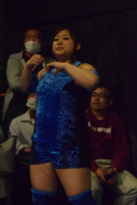 ケサ固めに(右写真)、辰巳バタバタ暴れてエスケープ、ミウラにタッチ。中島も山下にタッチ。