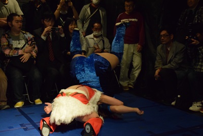 ミウラボディスラムからボディプレス、さらにゴーストバスター狙うが(右写真)、中島は脱出して山下にタッチ。