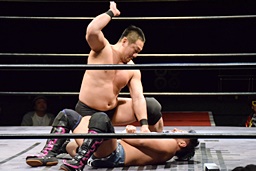 ボディスラムからエルボードロップ(右写真)、カウント2。