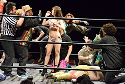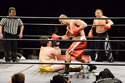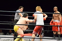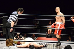松井レフェリーが立たせ、黒子のように鈴木を支える。そこにゼウスがパンチ(右写真)、鈴木ダウン。