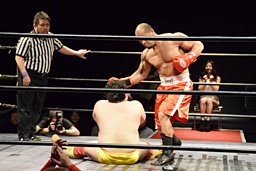 ゼウスにボディスラムからムーンサルトプレス、ゼウスかわす(右写真)。