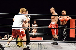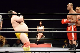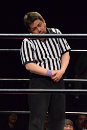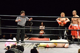 松井レフェリー座り込んだままの伊橋に無理矢理ファイティングポーズ取らせる(右写真)。