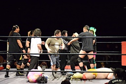 ラウンドガール4回目の登場前に試合が終わってしまったのでいきり立つセコンド陣(左写真)。