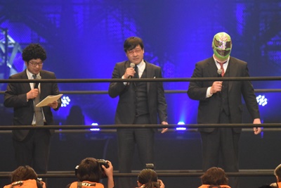 酒呑童子勢がリングに上がり「酒盛りだ!」(左写真)