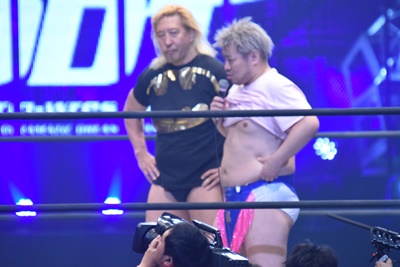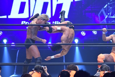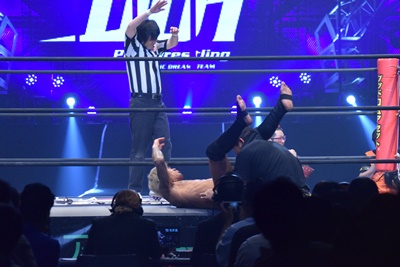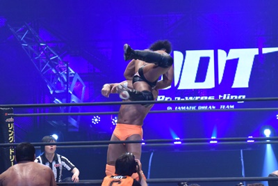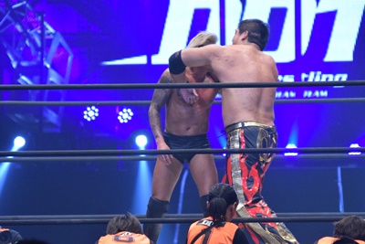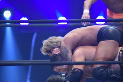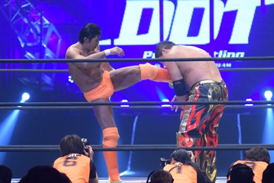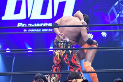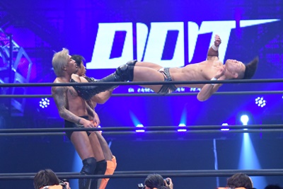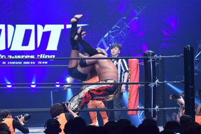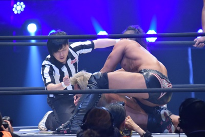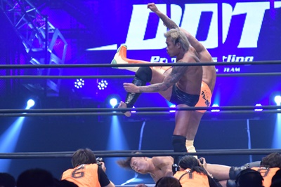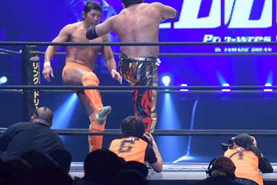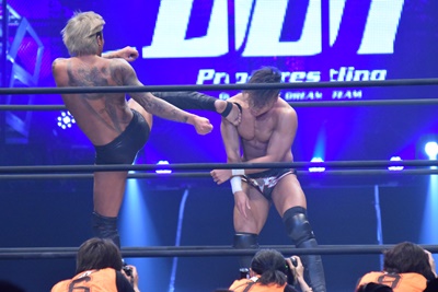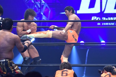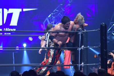 DAMNATIONの奇襲攻撃でスタート、王者組はDAMNATIONを場外に出しダブルのエプロンPK狙うが石川は坂口の足をキャッチ(右写真)、