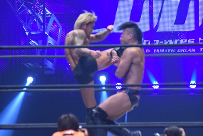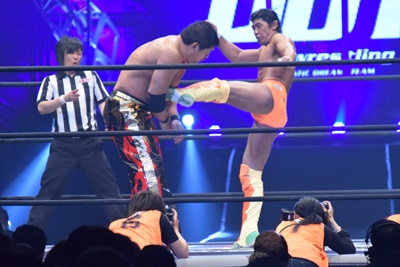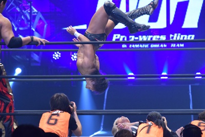 ランニングローキックに行くが遠藤かわしてロープに飛びハンドスプリングオーバーヘッドキック(左写真)、石川にタッチ。