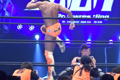 遠藤ロープに飛んで2人にドロップキック(左写真)、場外に落とす。
