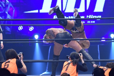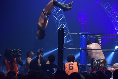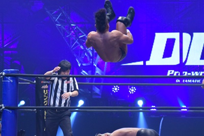 セカンドコーナーからダイビングダブルニードロップ(右写真)、カウント2。