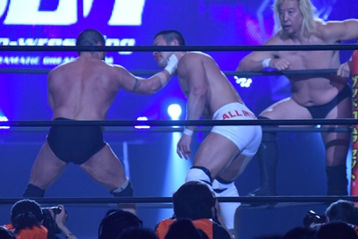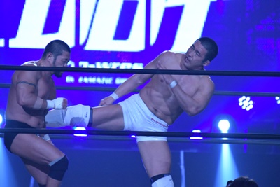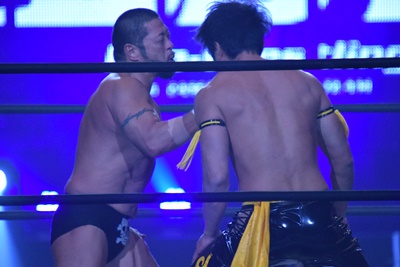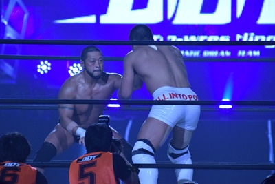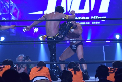 東郷ペディグリー狙う、KUDOブロックしてバックスピンキック(左写真)、大山にタッチ。