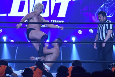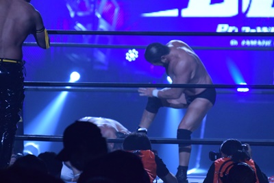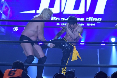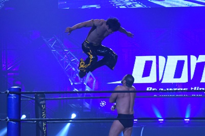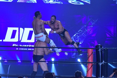 東郷が2で返すとKUDOはその場でジャンプしてダブルニードロップ(左写真)。