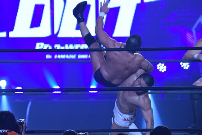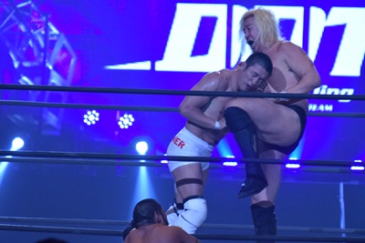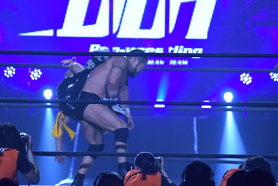 大山が入ってきた山をボディスラム、KUDOがコーナーからダイビングダブルニードロップ行こうとするが(右写真)東郷が阻止。
