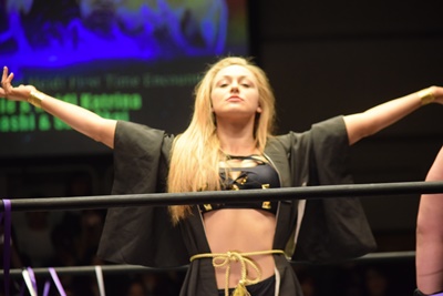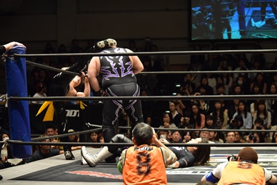 ポーリーは入って来たKUDOと高梨にも両腕でラリアット(左写真)、2人を場外に。