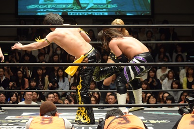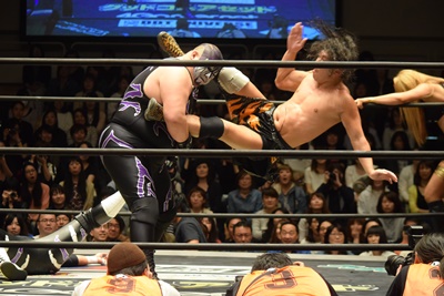 佐々木ロープに飛ぶ、KUDOカウンターのソバット(左写真)、