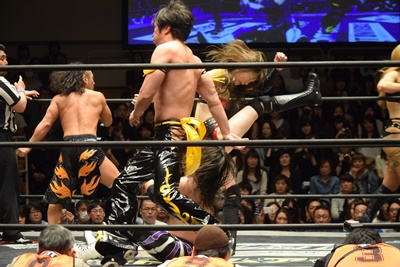 ポーリーにもう一発ミドルキック、佐々木をロープに振ってキチンシンク、突っ込んできたポーリーにエプロンからハイキック(左写真)、